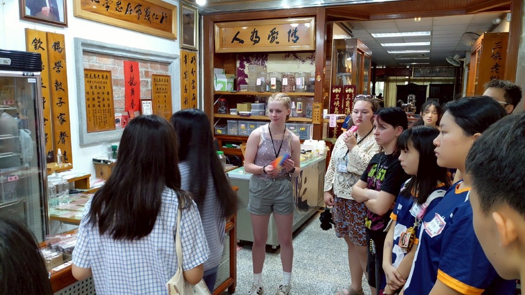 三峽同學與外籍學伴在百年老店元春中藥行 。(新北市教育局提供)