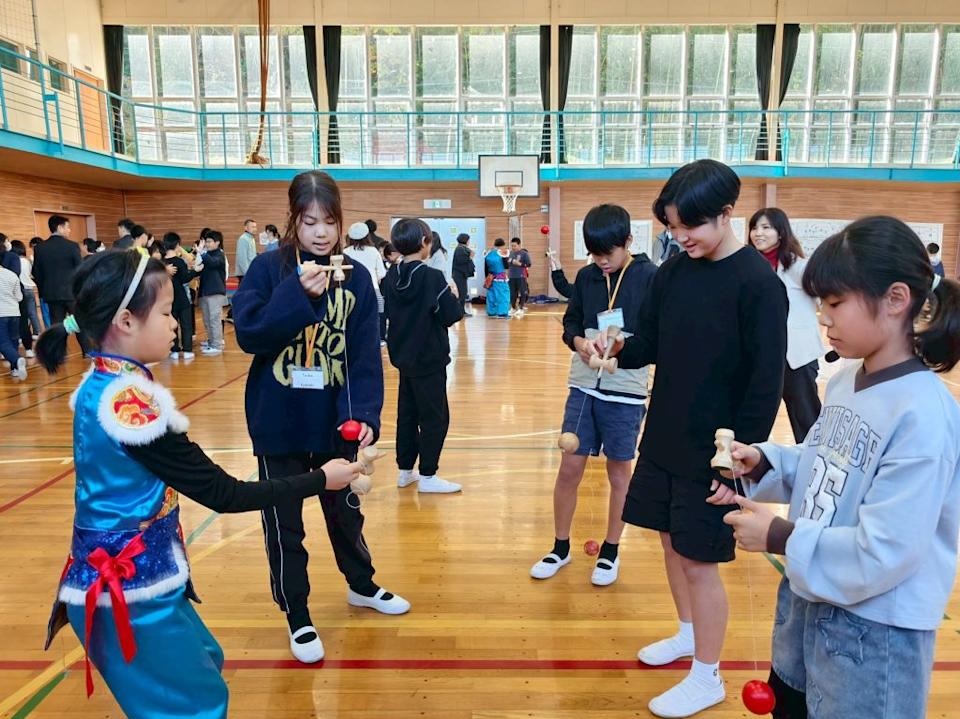 社子國小與瑞穗小學生玩劍玉童玩。(圖/教育局提供)