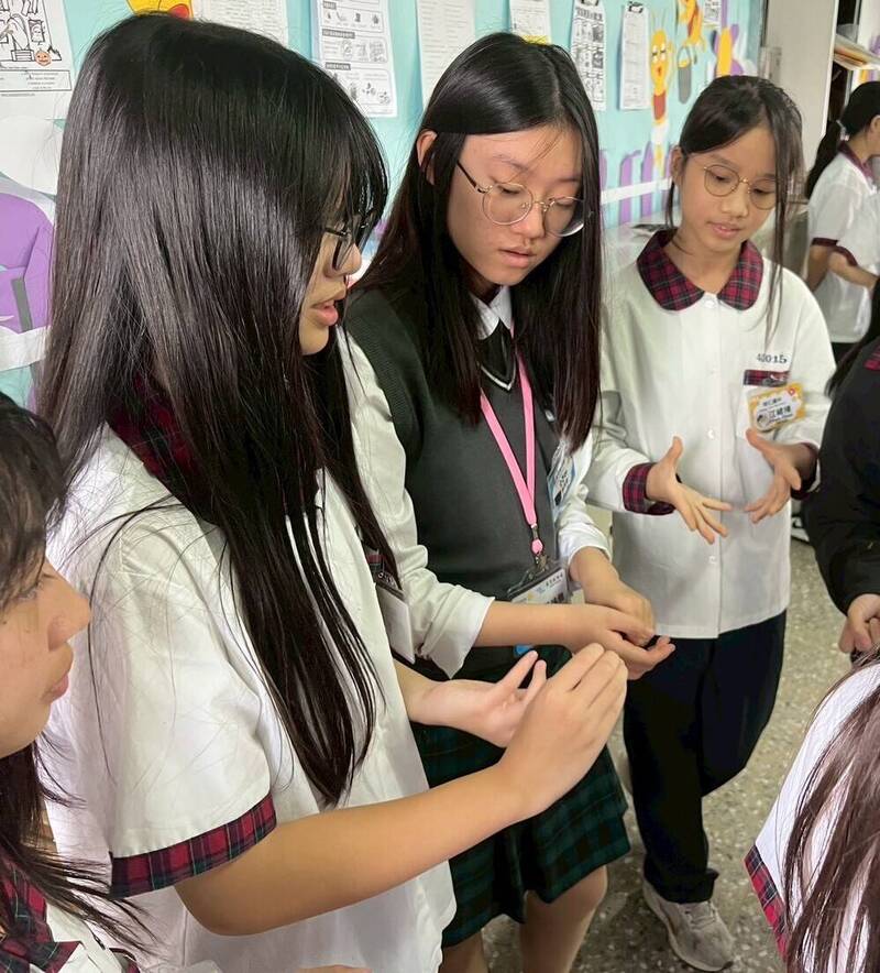 韓國首爾文昌國中學生,至苗栗市明仁國中參訪,兩校學生進行童子軍手勢教學。(明仁國中提供)
