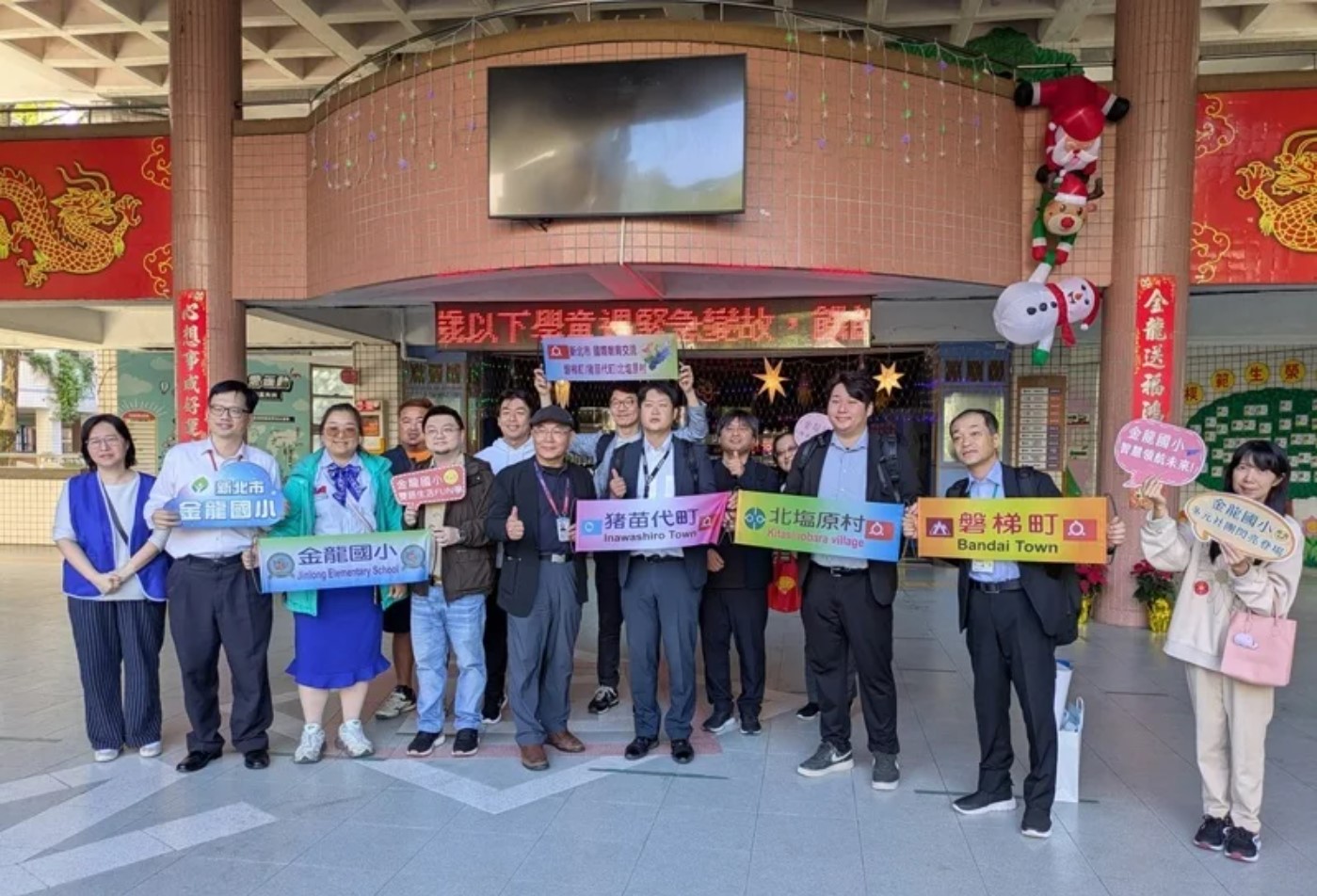 訪問團一抵達金龍國小,校長呂金榮以及家長會長、率領主任團隊與教師代表,在川堂迎接,展現金龍國小的熱情,在大合照之後,一行人前往國際文教中心,進行簡報與交流,金龍國小還特別準備紀念品、學生創作與汐止百年紅龜粿,讓遠道而來的貴賓,感受到台灣的溫暖與熱情。
