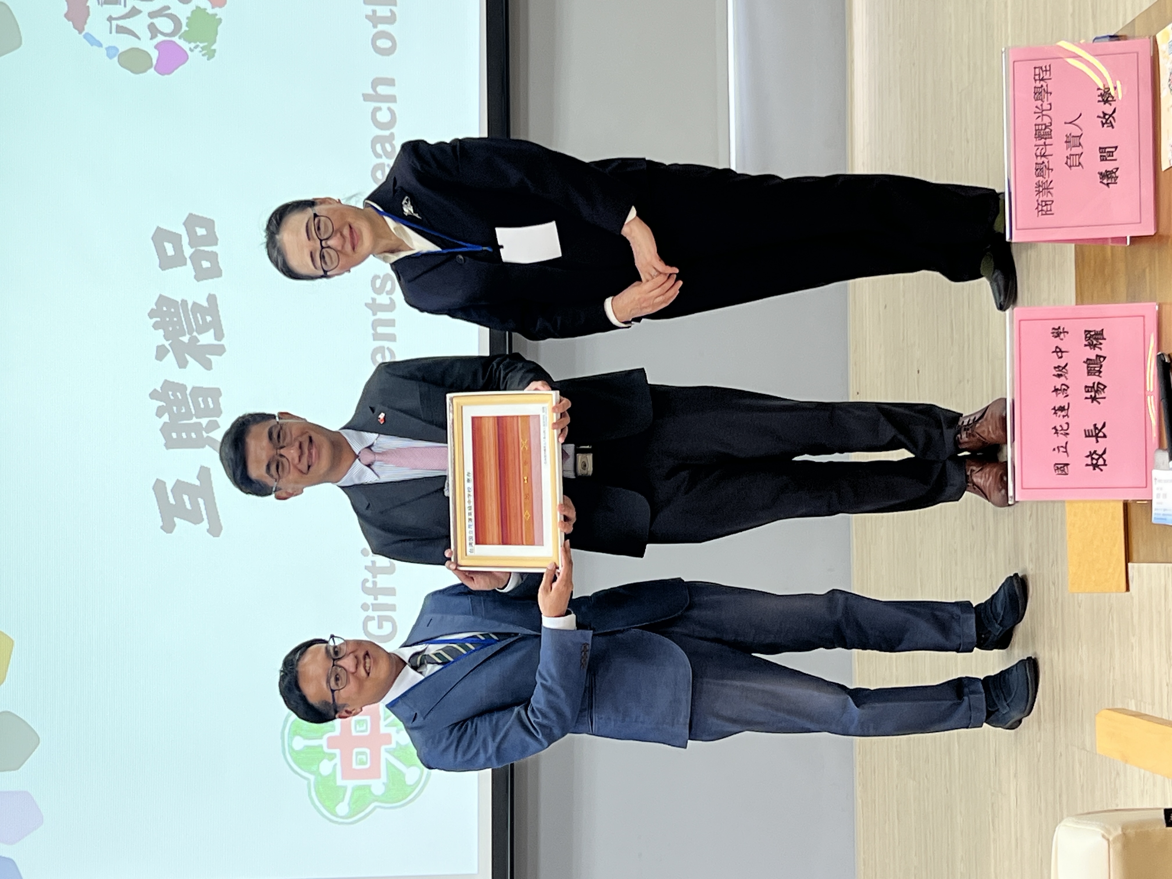 花中楊鵬耀校長與八重山商工儀間政樹主任、石垣麗子先生交換禮物