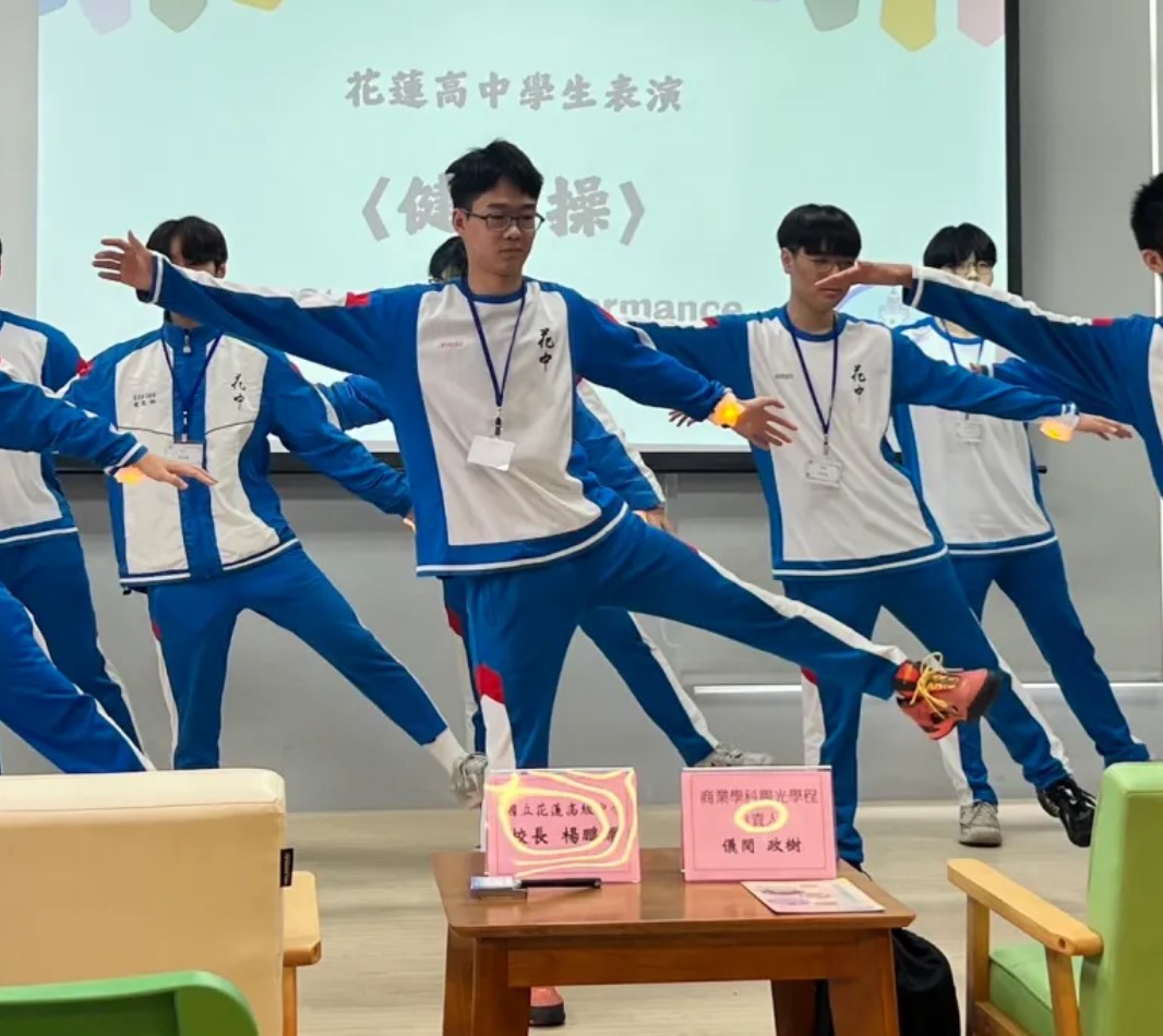 文藝表演精彩連連:花蓮高中帶來充滿活力的小學生健康操,以及戴上「陽光女子合唱團」演出劇目中象徵歡樂與正能量的星星手環舞蹈,歡聲笑語充滿全場。八重山商工的同學們則回饋以震撼人心的沖繩祭典舞蹈,讓全場師生大開眼界,見識到琉球傳統文化之美。