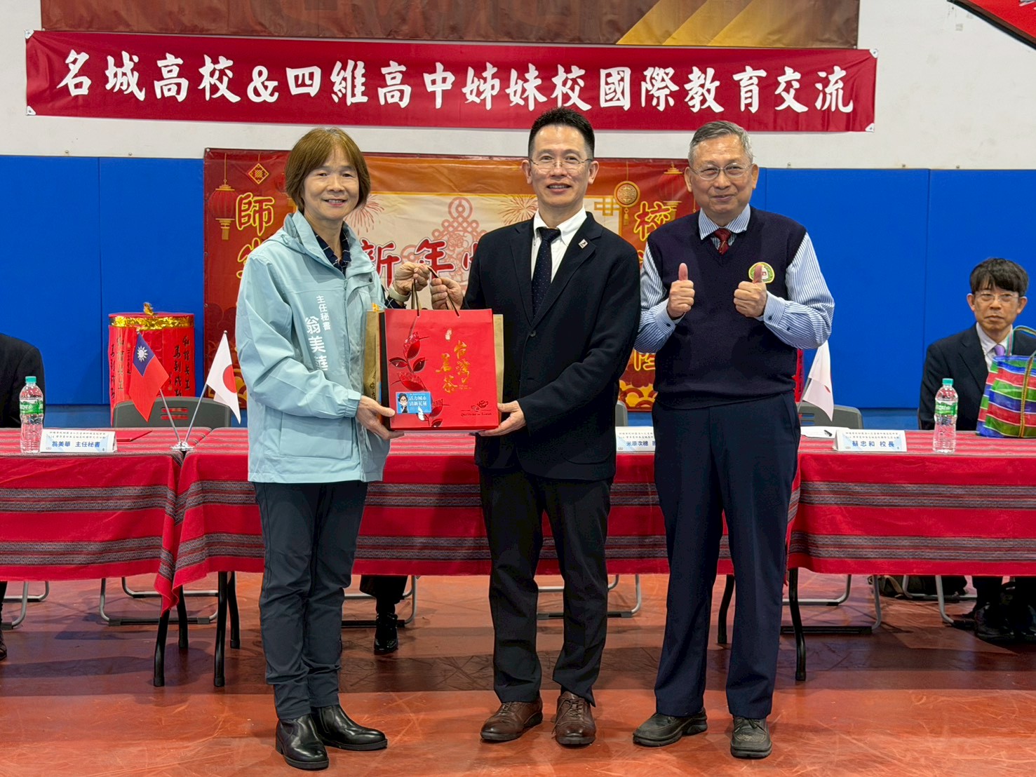 花蓮市公所主任秘書翁美華(左)致贈日本名城高校伴手禮,由副校長米原次穂(中)代表接受。