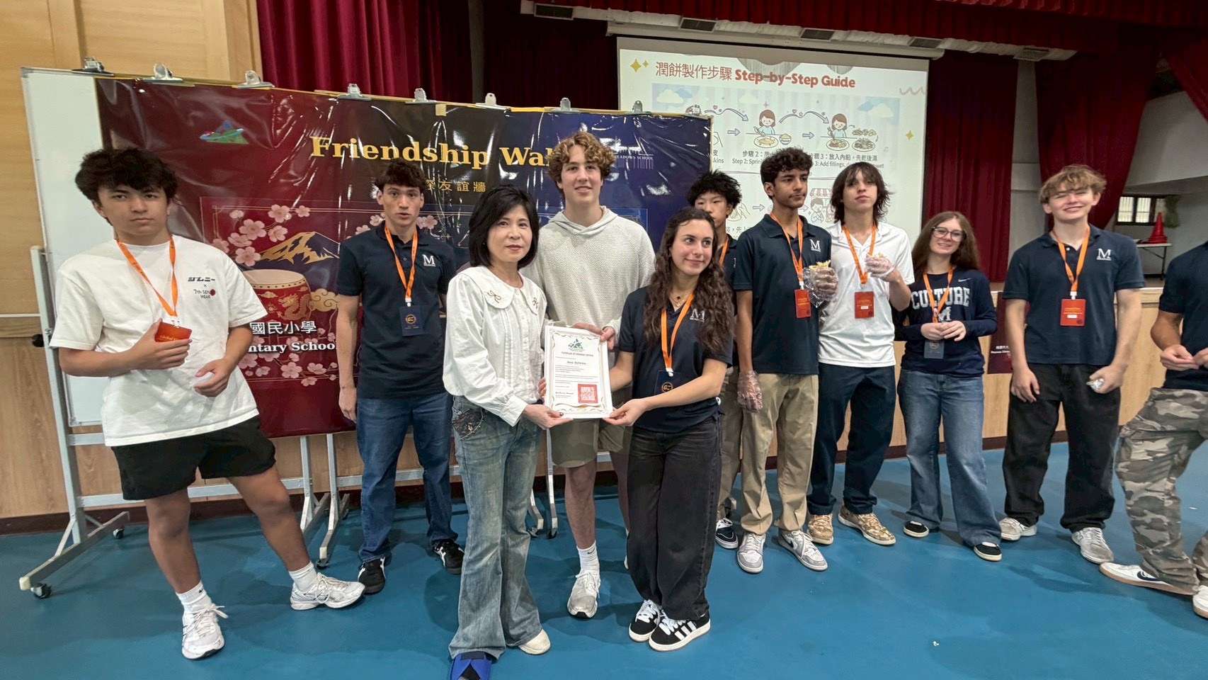 交流活動的高潮是結合食農教育的「潤餅午餐交流」。美國學生分組分別深入各桌與大園國小學生一同體驗台灣傳統美食「潤餅」的製作過程 。校方特別準備了豐富的在地食材,包含高麗菜、豆芽菜、紅燒肉、玉米、豆干、香菜等,並細心地介紹潤餅起源於古代「春盤」的文化意涵。在「折皮、處理、烹調、組裝」四個功能區中,台美學生攜手合作,學習如何從備料到餐桌,親手製作屬於自己的潤餅 。這不僅是一場味覺的饗宴,更是食農教育與文化推廣的完美結合。