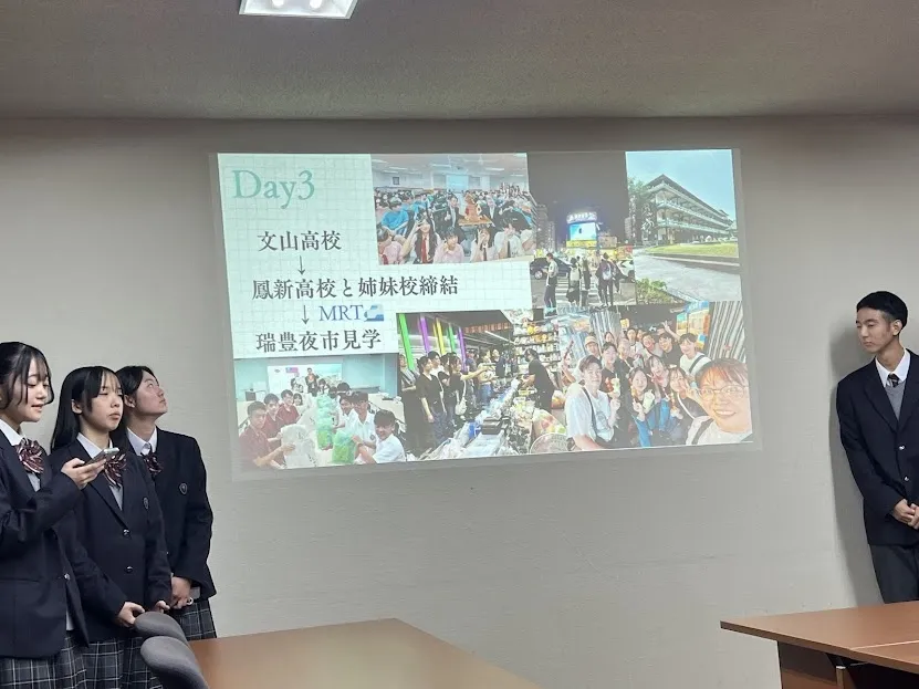 【イベント】高校生台湾派遣事業 2026-01-23 00:00:00 (名寄日台親善協会) 令和7年10月19日~25日の間、高校生台湾派遣事業として名寄高校の生徒6名が台湾へ行ってきました。 今回は台湾の高校4校と大学1校を訪問し、その中で現地の鳳新高校と初の姉妹校締結をしました。 このほか、アジアドローンセンターや台湾タイル博物館、文化路夜市など様々な施設やイベントを巡りました。 30日には帰国報告会が市役所で開かれ、加藤剛士市長、藤田健慈名寄日台親善協会副会長が出席しました。 照片顯示他們在匯報會上作報告 Previous Page