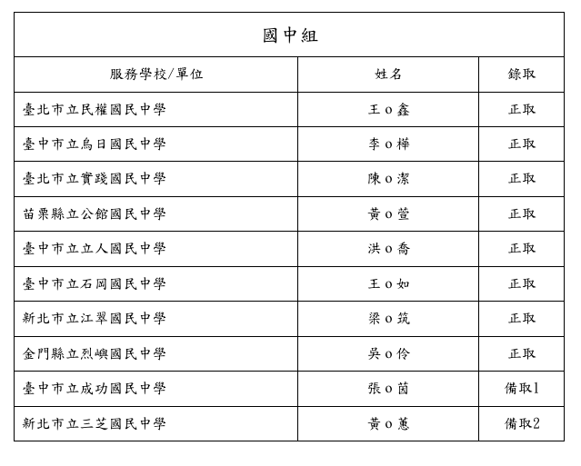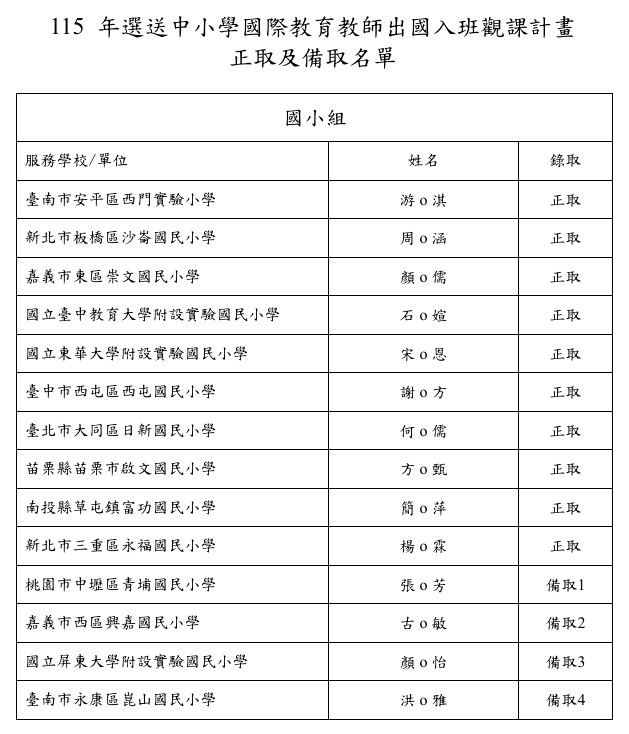 「115年度選送中小學國際教育教師出國入班觀課計畫」正取及備取名單公告