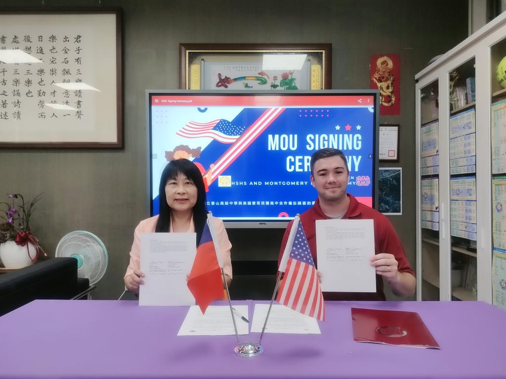 回到美國之後,兩校情誼並未就此中斷,透過國教署的與國外校際合作推動線上教學計畫的幫助,兩校持續保持線上同步互動。雖然有著14小時的時差,但本校學生想與對方交朋友的心意能夠克服一切。經過一番討論,決定使用臺灣晚上的時間上線與對方見面。就這樣又繼續了1年多,張老師與同事再度帶著學生前來拜訪。這次入班一起上了英文課與音樂課,並一起吃了本校的營養午餐。第一次來臺的美國老師和學生對於臺灣的一切事物都感到好奇,包含臺灣學校的課程以及學生升學制度和社團活動等,我們也安排了他們在課堂上有機會和臺灣同學互動,當然本次行程的重頭戲便是簽訂MOU了。對方學校校長因為公務繁忙不克前來,於是便先簽署好MOU委託張老師及美籍音樂老師攜至本校完成簽署。雖然兩校簽訂MOU過程幾經波折,但雙方合作的意願不減,期待未來能有更多交流的機會,此次MOU的簽訂也讓本校的國際教育里程碑再添一筆。
