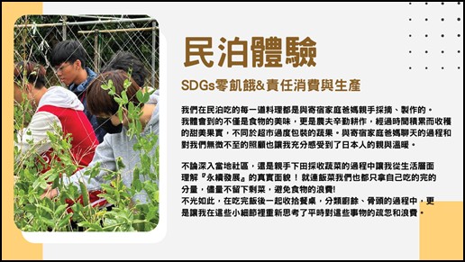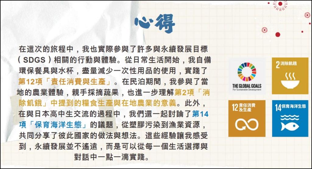我想,暫且不論交友的快樂,有明確目的性的調查和規劃、實際的走訪和感受經驗,是使我們在這一系列課程中,收穫快樂並成長的主要原因。謝謝所有使這場永續旅遊記憶永續的內中同學、日本學伴和師長們。」