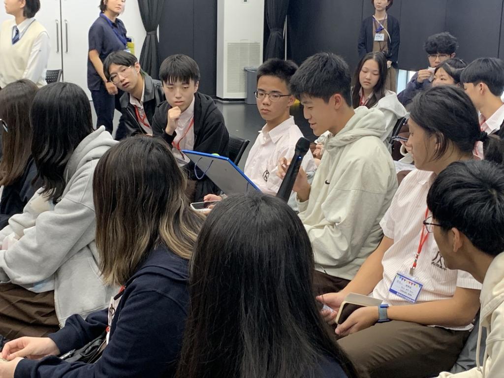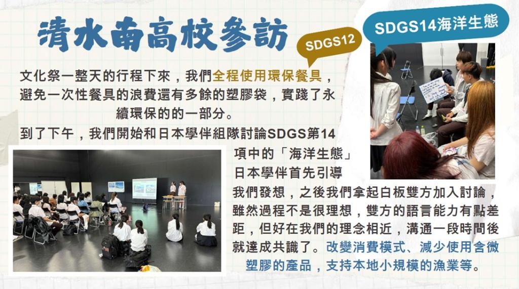 | (二)國際教育旅行活動出訪期間,與日本交流學校(清水南高校)與日本學生一同進行永續議題討論,融入永續旅遊概念 |