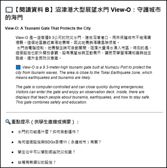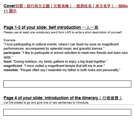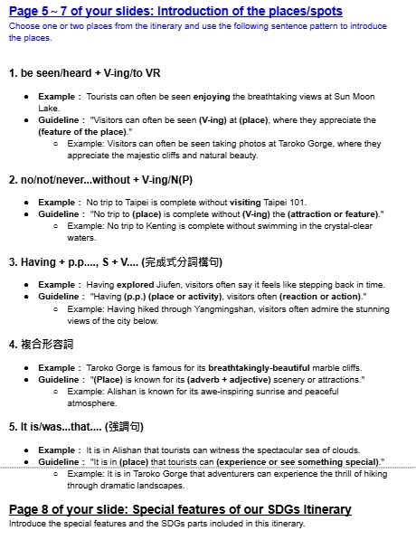 | (四)日方學生訪台結束後(返國後),教師引導學生進行永續旅遊進行後的反思討論(學生並製作簡報分享交流),教師提供英語句型結構促進跨語言的學習使用 |