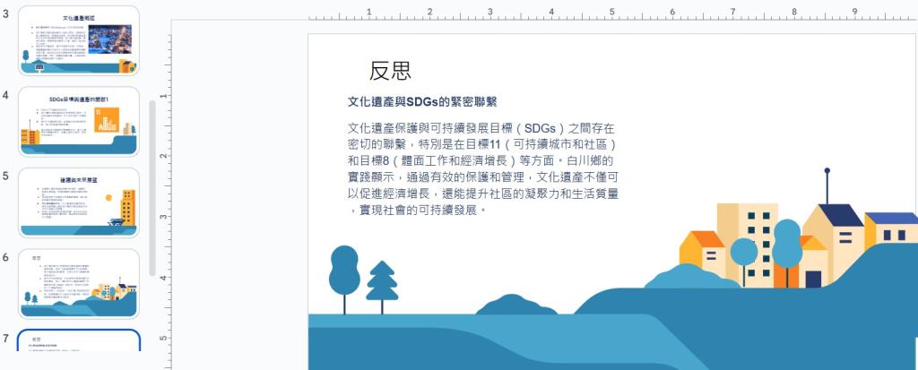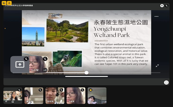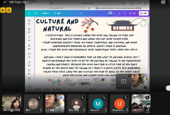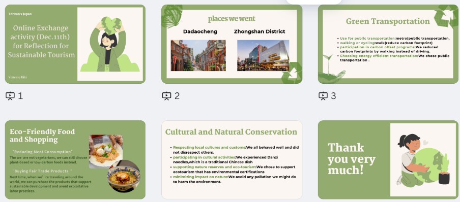 此後,我們與日本的學伴進行了線上的交流,互相分享彼此調查家鄉永續旅遊的成果,驀然發現對自己居住的地方我們保持著一股別樣的信心,會竭盡所能的打破語言隔閡,不那麼害怕使用「非母語」的生硬,迫切地想讓對方知道這個地方,不論是名字又或者歷史和特色;也許會認為關於永續旅遊我們還能做的更好,但我們皆堅信著會有一個更好的未來。