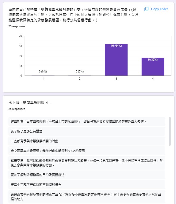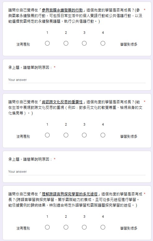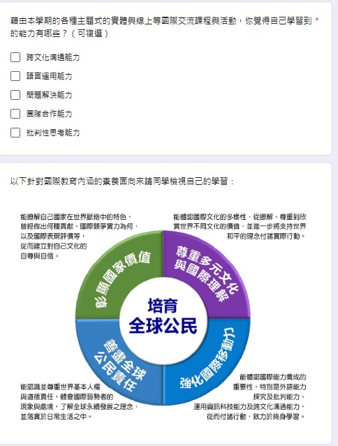 課程執行後對學生進行本課程國際素養與議題實質內涵習得回饋問卷表單