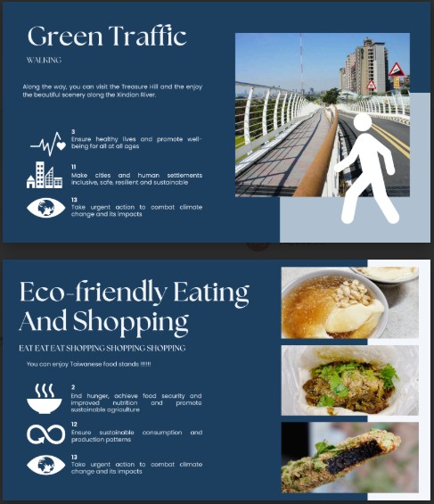 「首先,在這次的英文課程裡,我們透過文章閱讀,瞭解何謂「永續旅遊」,它的定義以及未來願景;接著和小組成員們一起在這個我們無比熟悉的城市——臺北,尋找符合永續旅遊概念的地點,一起規劃出能讓旅人(日本學伴)對臺北印象永續的旅遊路線,也是在這過程中,我們不時會發現:「啊!原來我常常去的這些地方符合永續旅遊的概念呀」,卻在發現這一美好事實的同時,不免反思「可是,我偶爾會穿過的那條小小的徑,卻與這之中的概念不同,是不是這一地方的永續旅遊程度還有待提升?」——更瞭解臺北、更細緻地發掘我日常行經的地方,這是我認為我在旅遊路線規劃時收穫最多的地方。