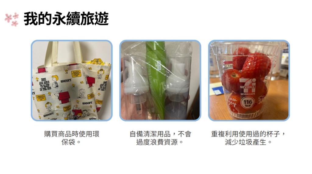 | (二)教師說明與引導思考永續旅遊後,學生應用與思考,請學生練習選定一個旅遊景點,說明該景點的永續意涵,以此確認學生理解,以下為學生回答作品呈現: |