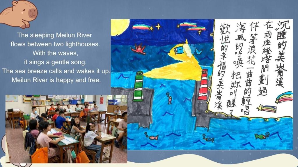 繪本能完整呈現美崙溪居民生活故事,敘事清楚有條理,能清楚感受到家鄉特色。 | 繪本能呈現美崙溪部分生活故事,內容結構清楚,但細節或創意不足。 | 繪本呈現部份資訊,家鄉特色表現不明顯,故事結構較鬆散。 | 繪本內容需由教師引導,故事結構鬆散,內容待充實。 |
