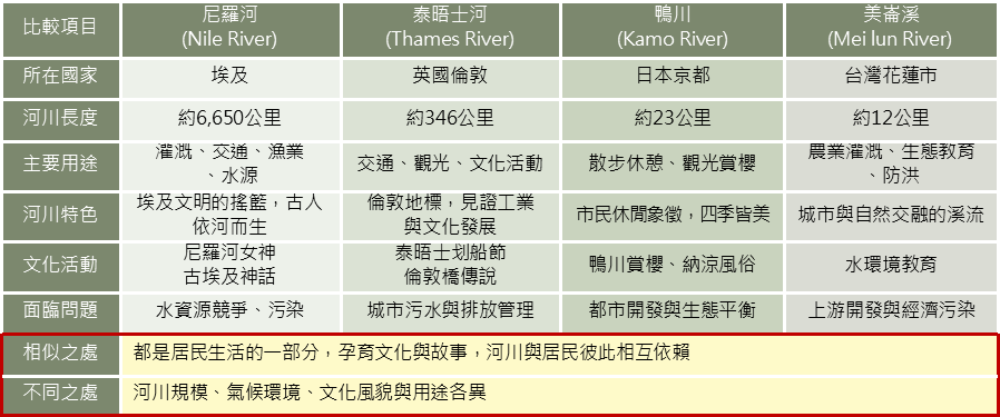 - 由師生共同整理出四條河川的比較表格,歸納出共通點與差異性。
