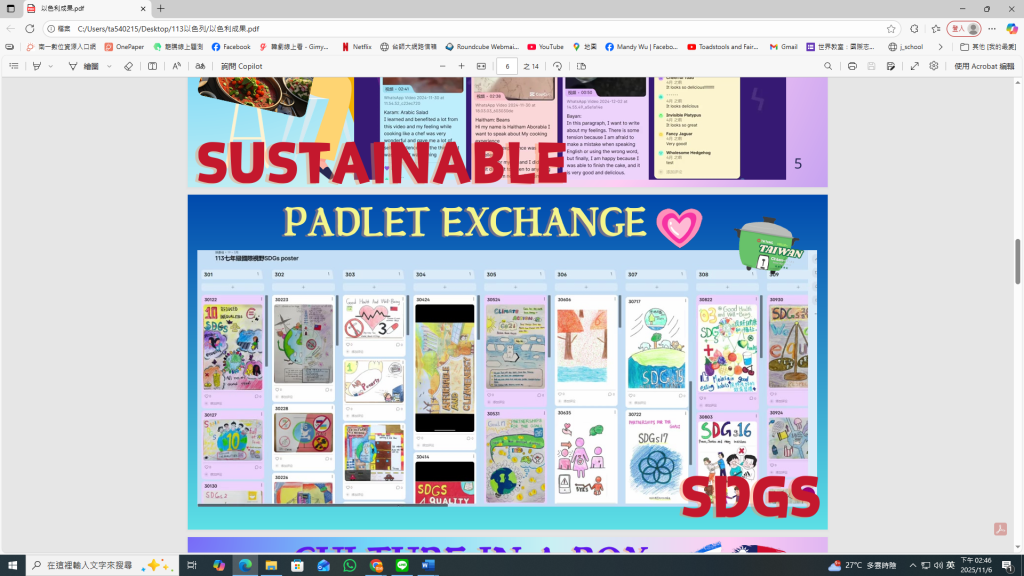 學生在真實交流情境中使用英文進行表達,體驗了語言作為溝通橋樑的重要性。部分學生雖仍需句型支架,但已能主動以英文書信、留言及口語報告表達情感與文化故事,如「This is my favorite snack from Taiwan. It shows our local taste.」交流內容逐漸由表層稱讚轉向深層提問與觀點分享,反映跨文化溝通能力的進步。 - 全球公民意識的萌芽