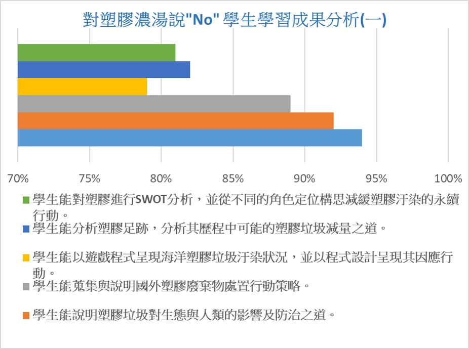 成果分析:學生能分析塑膠足跡,分析其歷程中可能的塑膠垃圾減量之道,並能對塑膠進行SWOT分析,並從不同的角色定位構思減緩塑膠汙染的永續行動。 |