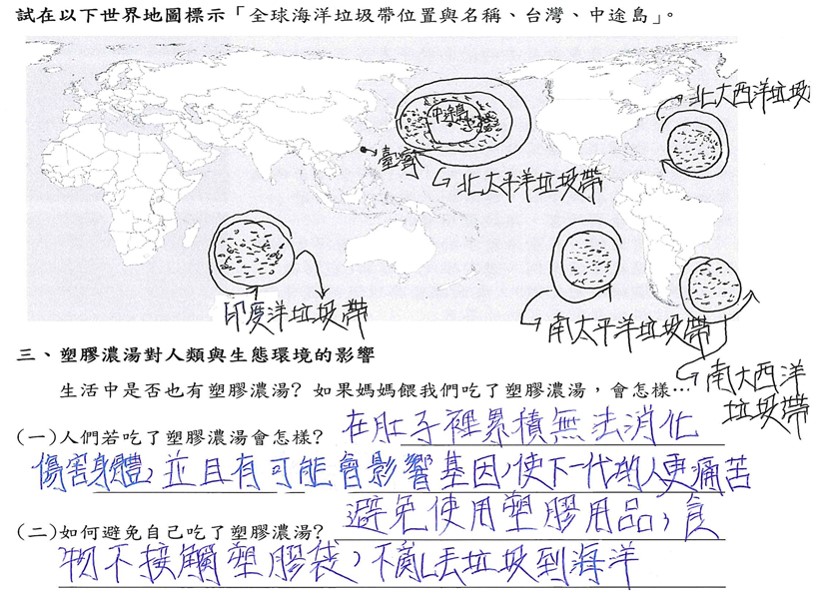 成果分析:學生能標示全球海洋垃圾帶的分佈位置與名稱,說明塑膠濃湯對人體的影響,以及如何避免自己也食用了塑膠濃湯。 |