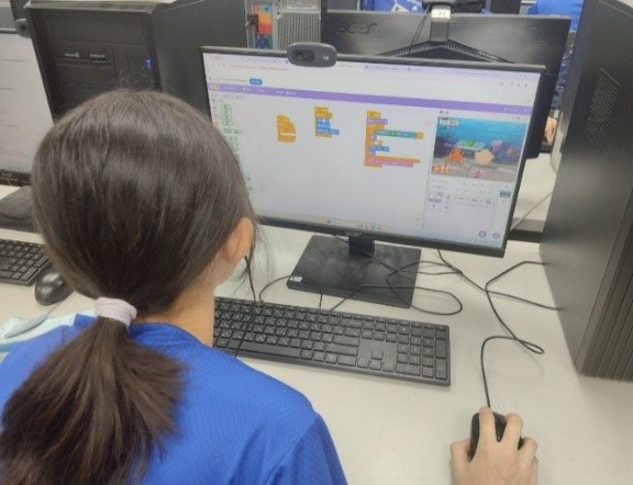 學生進行Egame程式設計與減少海廢的方式說明 |