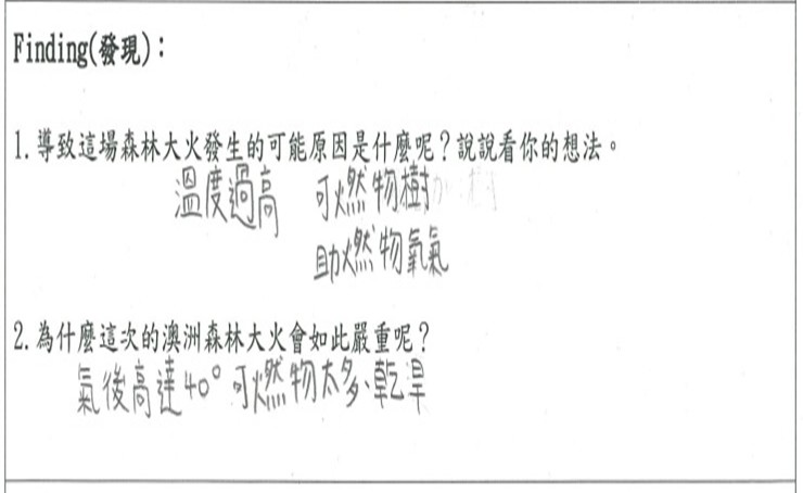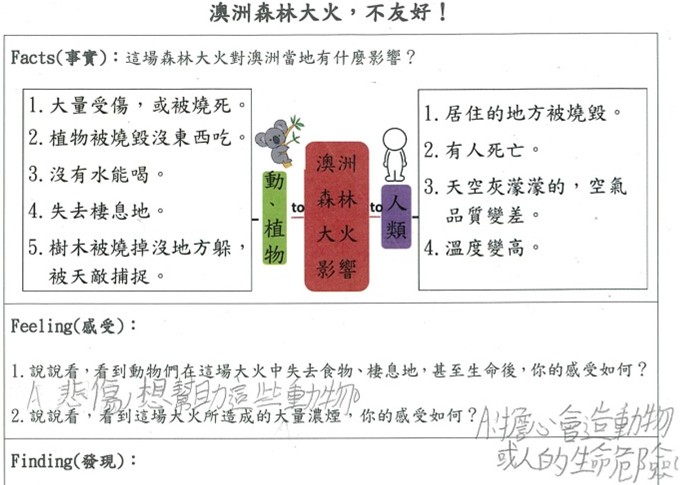 透過澳洲森林大火災情影片,讓學生以無尾熊的角度同理,並分享自己的感受 |