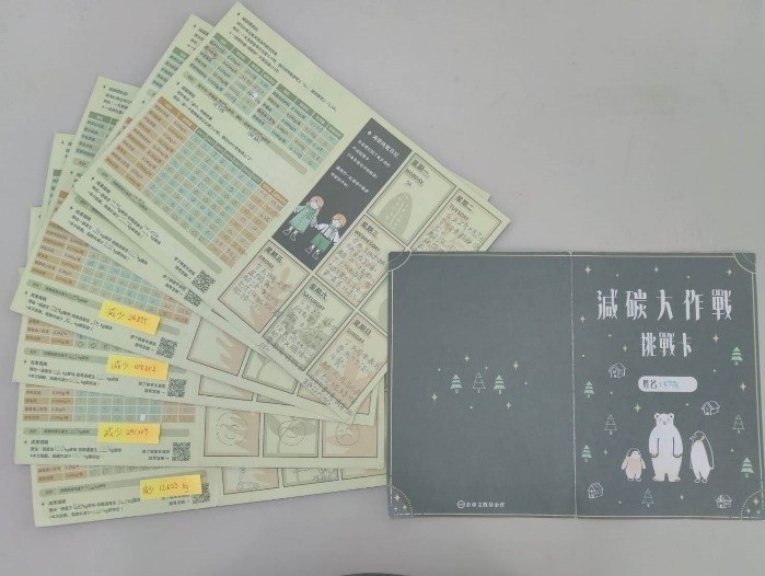 透過金車文教基金會「減碳大作戰」活動挑戰卡,進行完整一周的減碳行動,並在過程中將遇到的困難、解決方法或感受,記錄在活動挑戰卡的減碳挑戰日記中。 |