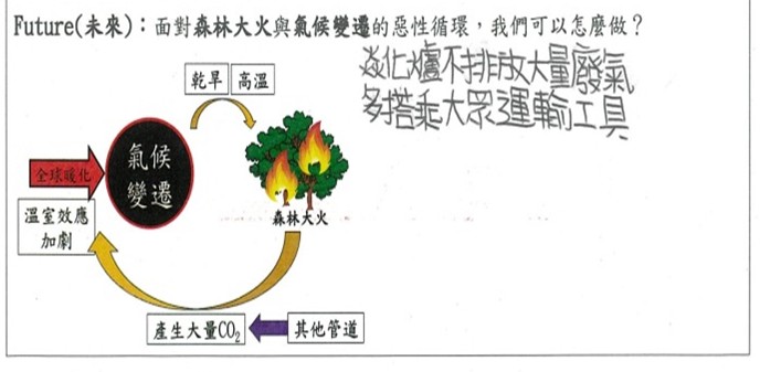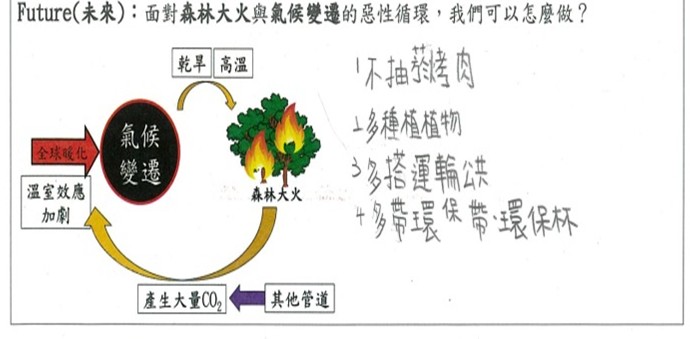 分享課前以閱讀文本為基礎所完成的「澳洲森林大火影響」概念圖,回顧其影響。 |