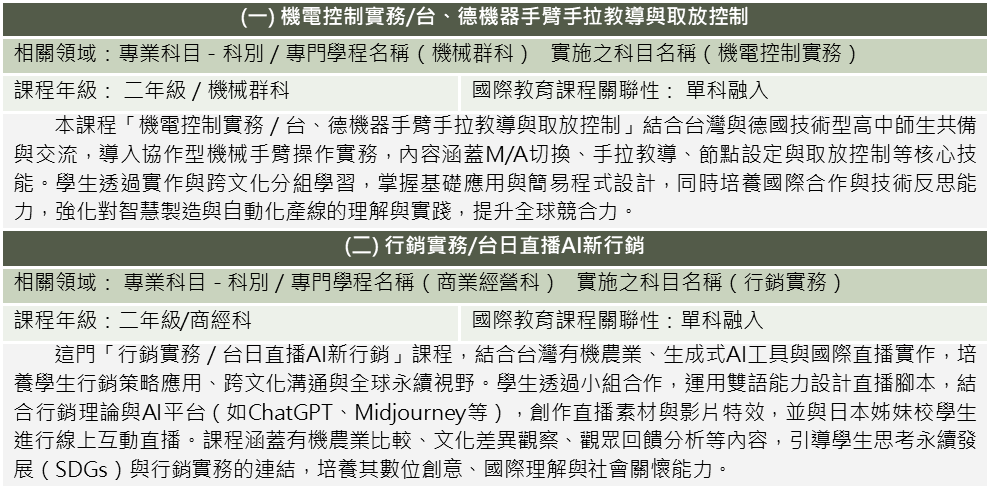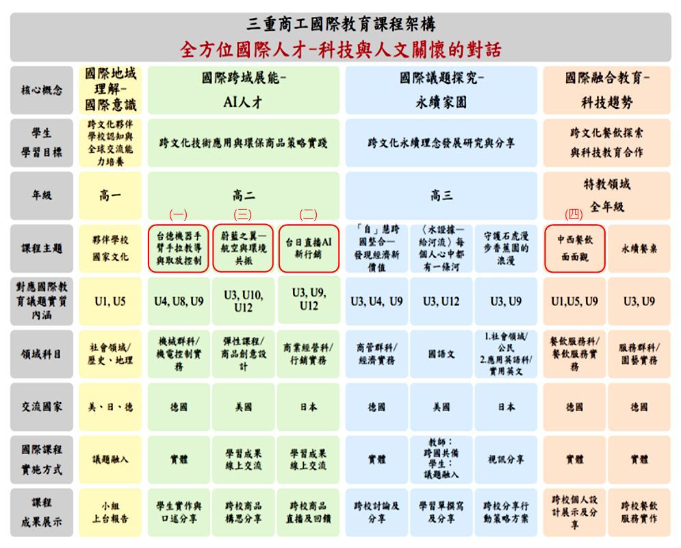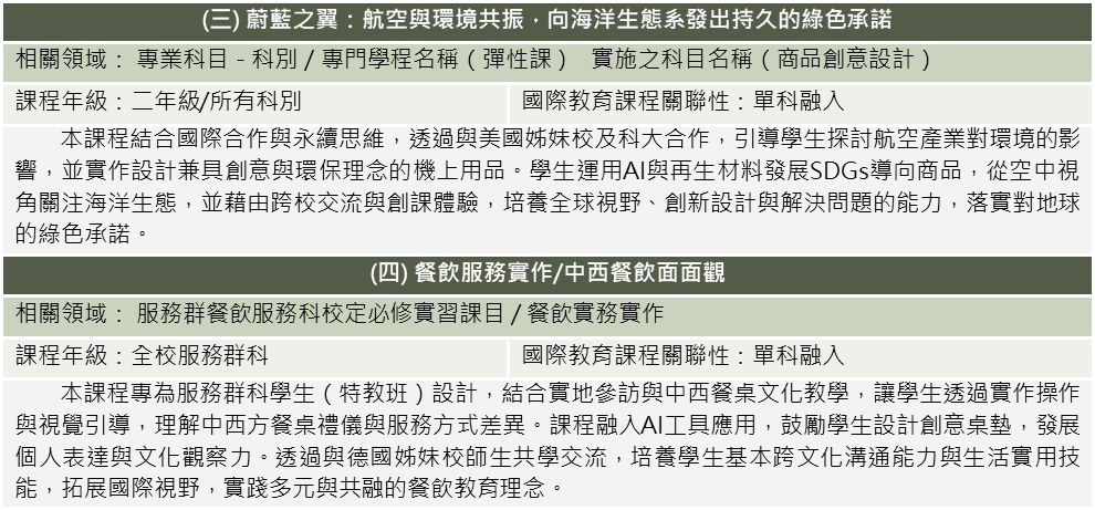 課程推動結合國際姊妹校合作、跨國線上交流、實地參訪與AI數位工具應用,讓學生在專業學習與跨文化互動中深化學習經驗。透過機械、商業、設計與餐飲等多元專業領域課程實踐,培養學生具備跨文化溝通、國際合作與創新應用能力,逐步發展成為兼具專業技能、國際視野與人文關懷的技職人才。