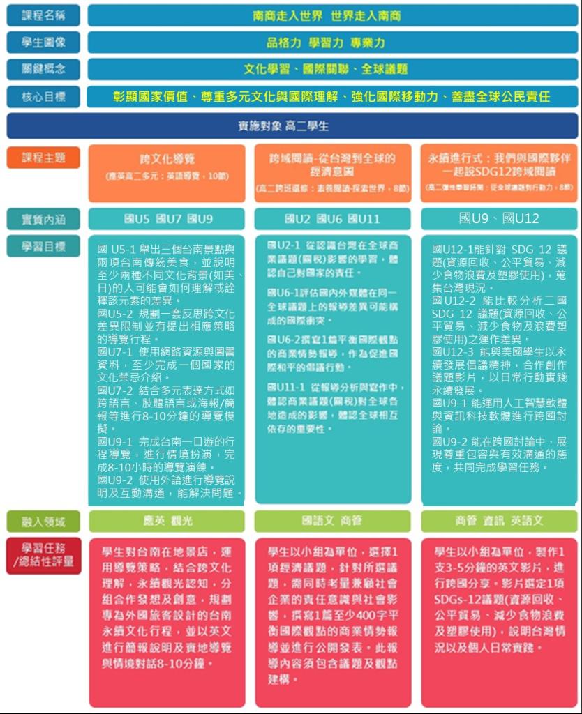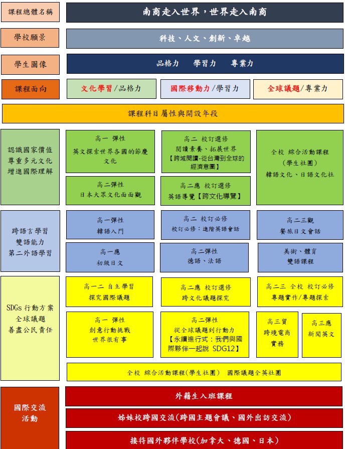 為符應新時代趨勢,培育學生具備專業素養、科技運用、創新思考、與關懷社會等能力,本校國際教育課程「南商走入世界,世界走入南商」循著文化學習、國際移動力及全球議題等課程面向,以跨領域、跨群科方式規畫全校課程內容,由各科規劃課程,依課程性質邀請校內其他各科教師,共備共同討論,以打破傳統教學的侷限,開啟學生學習宏觀視野(如圖一)。