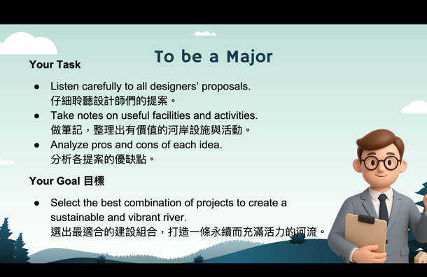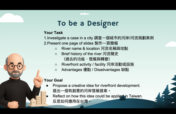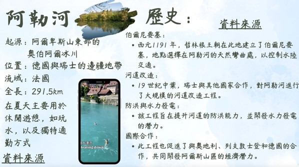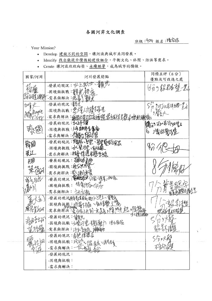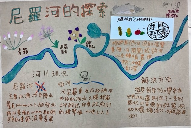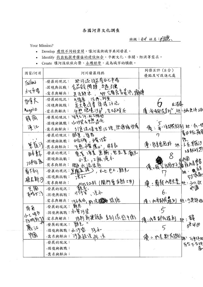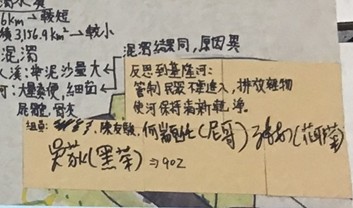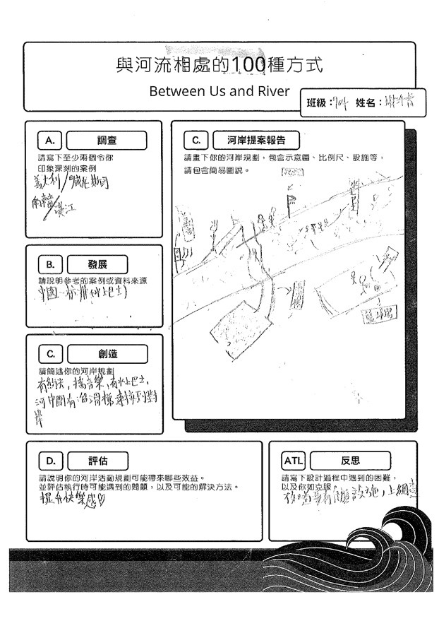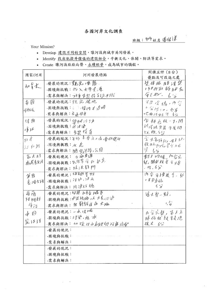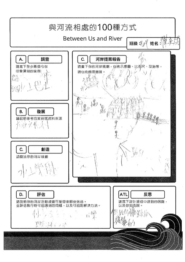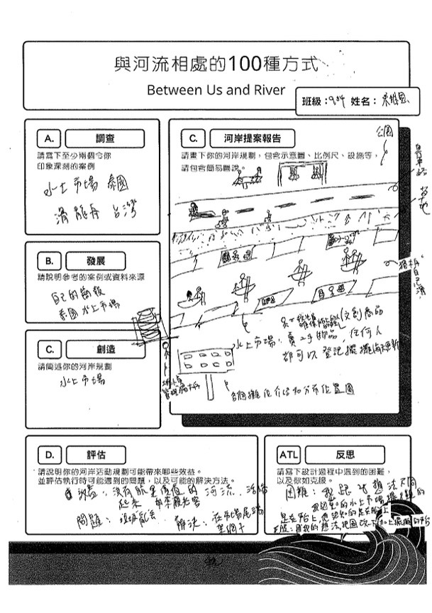 參與本次課程的學生共35人,在【與河流相處的100種方式】的學習任務中,共計有13人在國J03的面向達表現等級5之上,在關懷在地河川議題的行動上,能展現認同我國國家價值的行動;在國J05的面向計有8人達表現等級5之上,在不同國家案例的探究中,觀察並比較各國的河岸活動並說明各國河川政策差異可能的原因,大多數的學生僅能描述差異,待進一步引導探究方能理解其成因與脈絡;最後在國J12的面向有33人完成行動方案任務,運用國際案例的探索思索在地方案行動的規劃與實施,達成探索全球議題,並構思永續發展的在地行動方案的任務。在行動後的反思中多數學生說明行動方案的可行性,並評估對社區可能的影響。相關探究歷程與成果如下方所示: