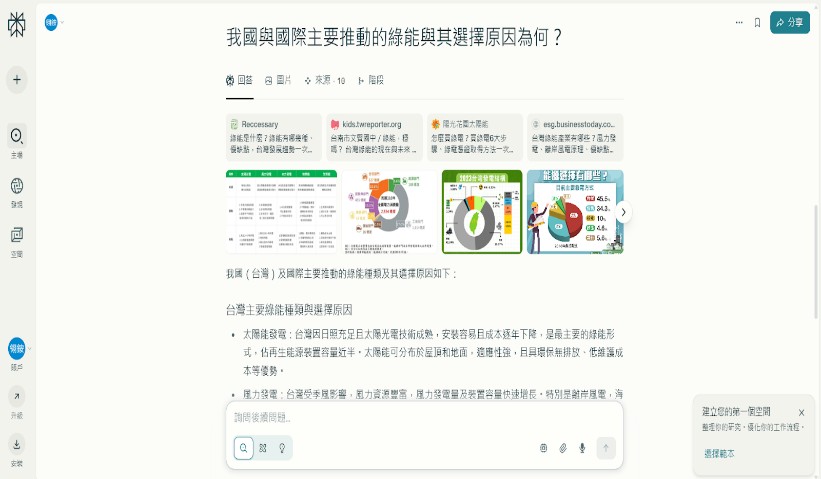 【強化國際移動力-國E7 認識各種國際能力。】 學生使用AI工具查詢資料,如「Chatgpt」和「perplexity」,發表於「Ziteboard」共用白板,回答綠能、永續發展相關的探究問題,並延伸出其他探究問題,展現批判與創新思考能力。 |