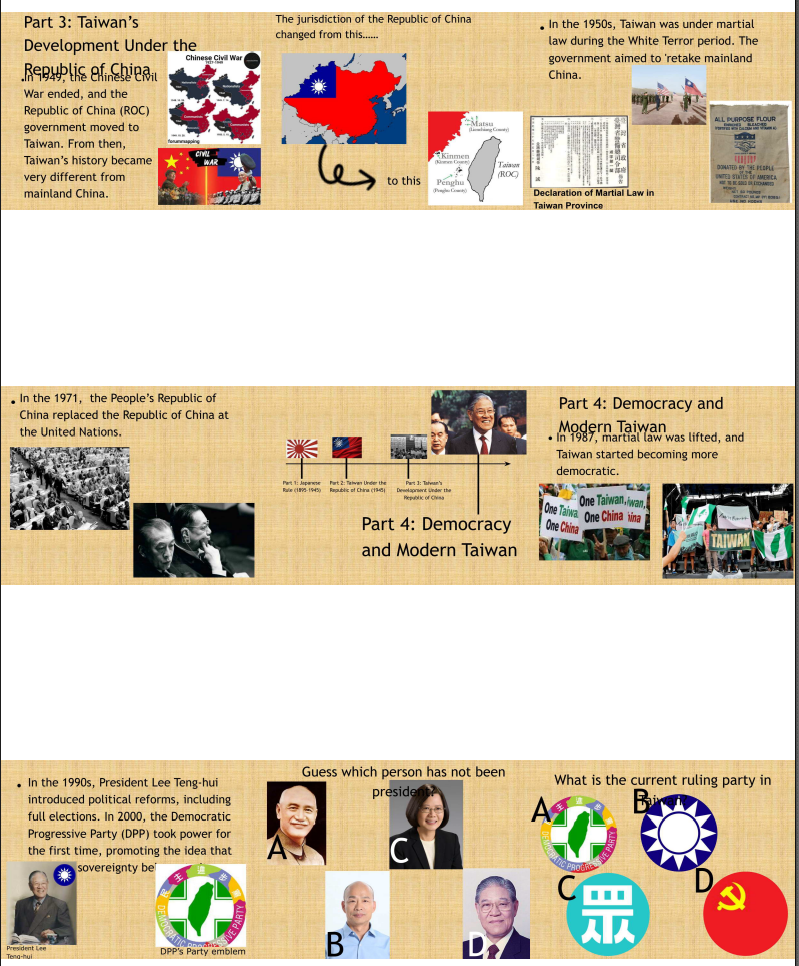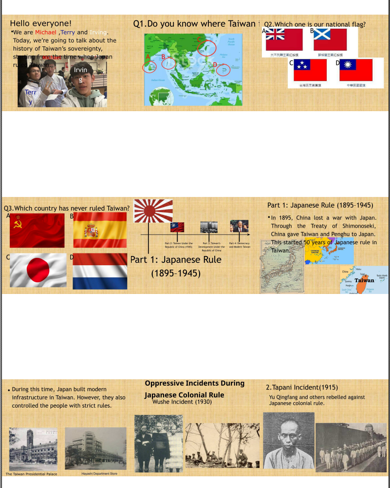 | 美國這麼大─學生文化探索報告:用英語介紹台灣歷史 https://docs.google.com/presentation/d/1-0zwFkcYLmSrhDzKgha2JAA2CxuB9mK0/edit?usp=drive_web&ouid=114647457259460422006&rtpof=true |