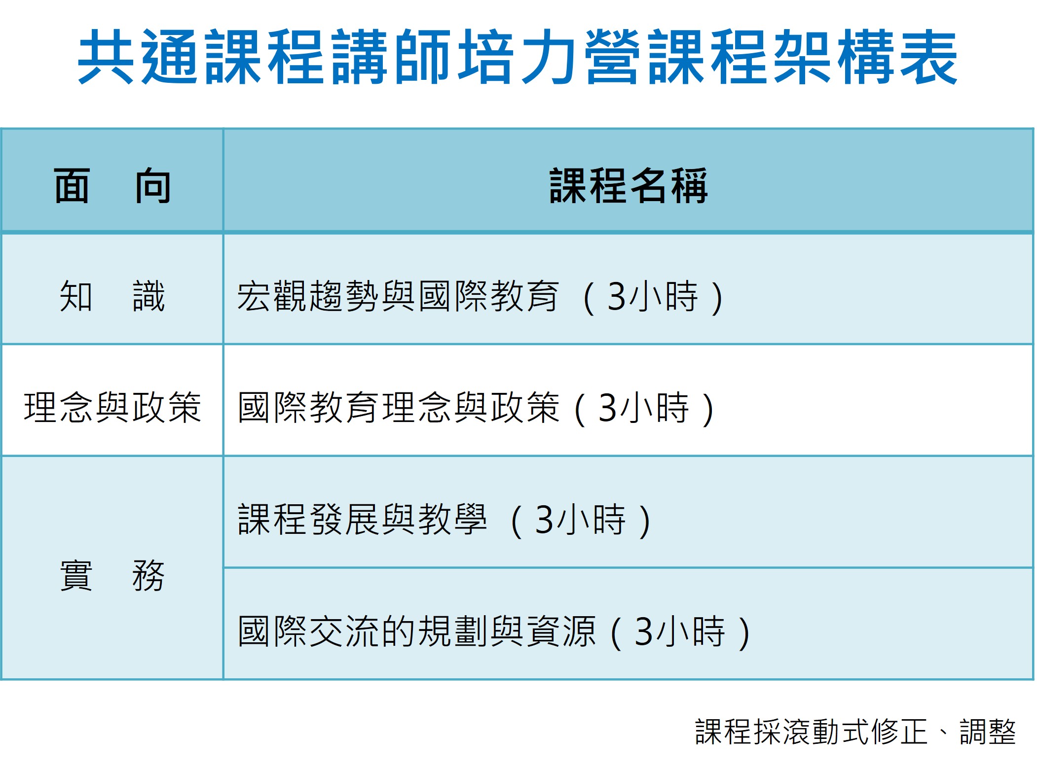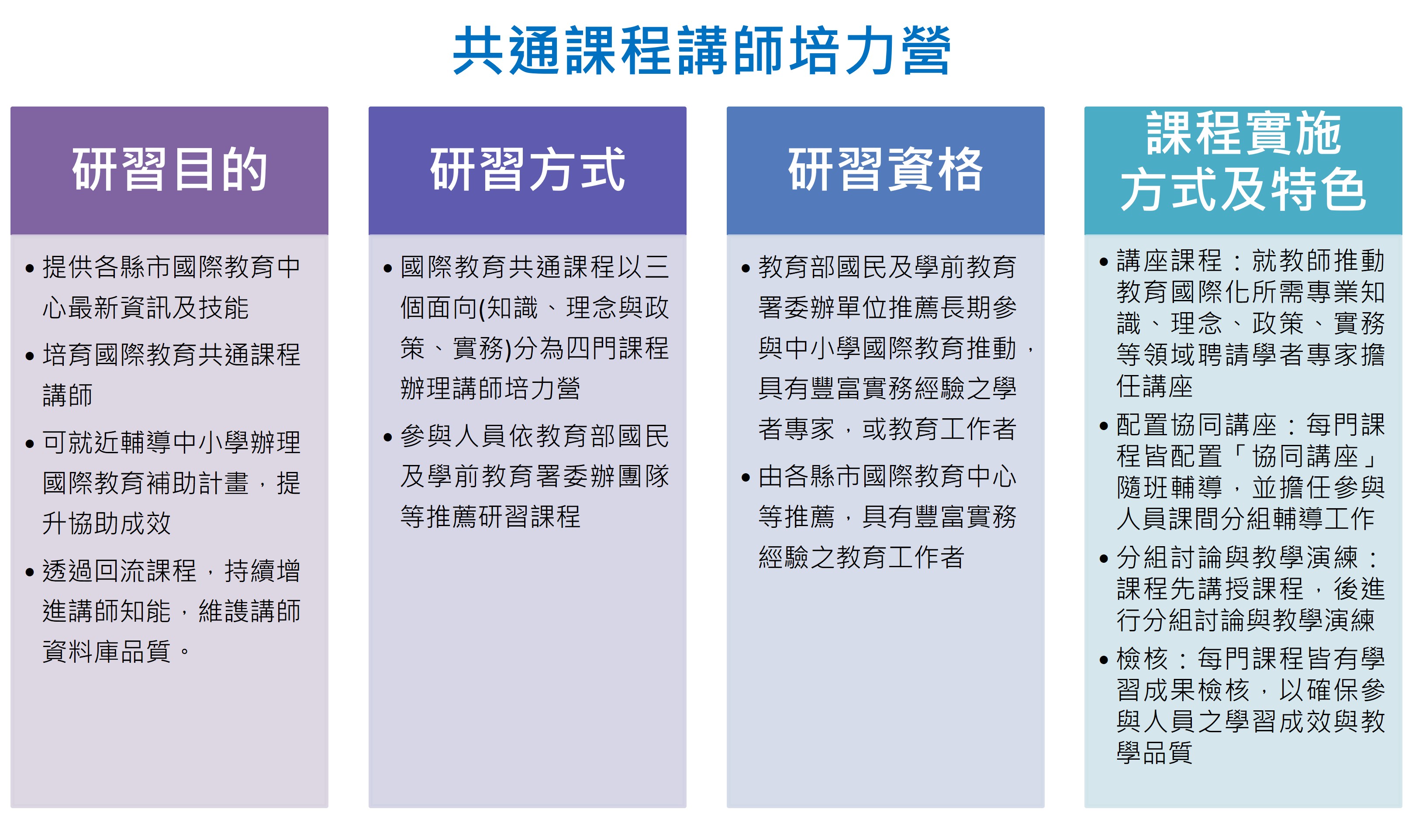 共通課程講師培力營與共通課程架構表 2026-03-04 14:54:47 透過國際教育共通課程講師培力營活動,以培育國際教育共通課程講師,並建置講師資料庫,提供國際教育中心未來辦理培力研習之師資來源。 回上一頁