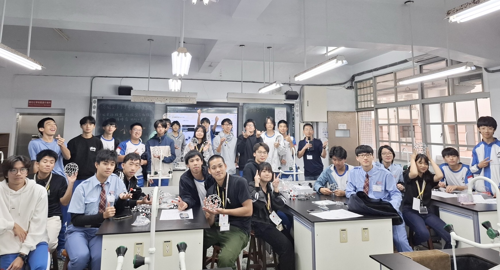 李俊賢老師帶領211班學生與日籍夥伴共同分組,走進科學館實驗室一同組裝分子模型,將抽象的科學元素轉化為親身體驗的驚喜。運用三度空間的立體模型將抽象的科學元素轉化為實體模型,親身操作化學分子的結構奧祕。從簡單的水分子到複雜的有機化合物,跨國青年們以好奇之心拼組各種分子型態,體驗豐富的元素世界。一位日籍學生興奮地說:「化学ってこんなに楽しいんだ!」(原來化學課可以這麼有趣!)