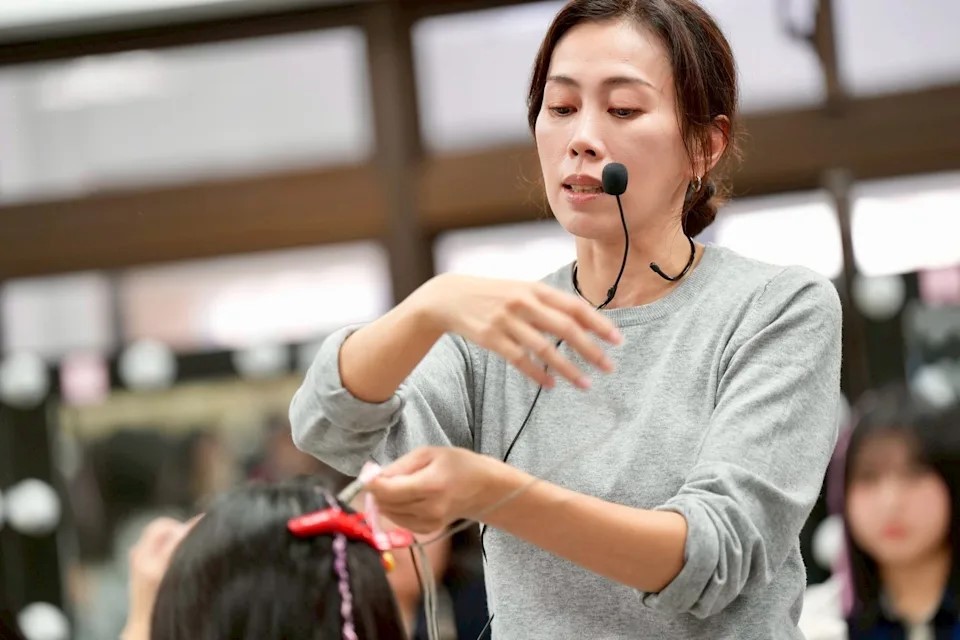 時尚造型科老師親自示範雷鬼編髮技術,帶領韓國學生體驗專業造型教學過程