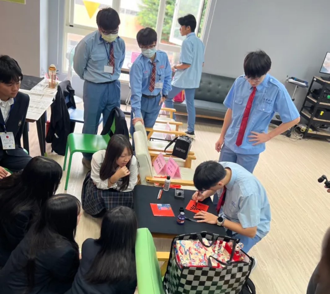 A組書法課由全國比賽得獎、翰墨功底深厚的高三生田柏祥同學親自執教,引領日本學生揮毫習字,體驗漢字書寫之美;B組熱轉印馬克杯工作坊由健護老師黃雅蕾指導,學生親手將自創文創圖案以熱轉印技術製作成紀念馬克杯,獨一無二別具意義;C組電子飛鏢體驗由高三陳信祐同學解說賽制,歡笑聲不斷,宛若台灣夜市的歡樂縮影。最令人感動的插曲,是高三生殷齊浩同學將自己多年從娃娃機夾得的公仔捐出二十隻,作為送給日本學伴的禮物,也讓「禮物外交」成為本次交流的溫馨亮點。