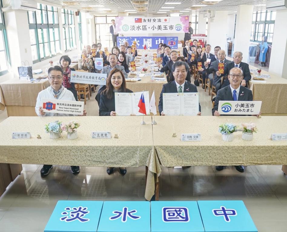 簽約儀式在新北市教育局副局長劉明超與日本小美玉市副市長深谷一広(Fukaya Kazuhiro)共同見證下,由淡水國中校長王潔雯與小美玉市教育長羽鳥文雄(Hatori Fumio)代表簽署,象徵淡水區與小美玉巿從城巿友好關係,正式向下扎根,開展校園層級的深度合作。