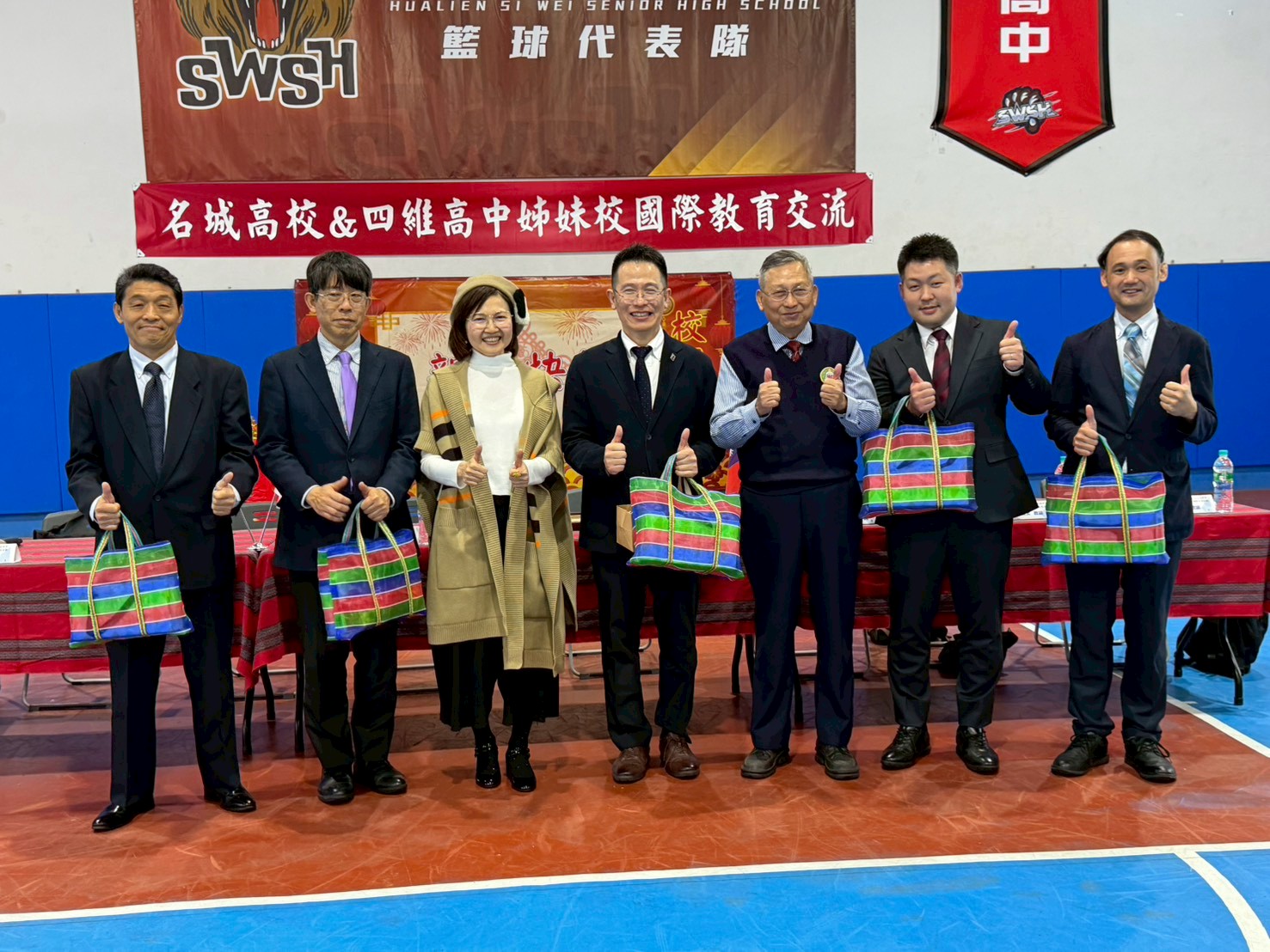 日本名城高校師長獲贈土本手提袋,相當感謝四維高中董事長黃淑怡(左三)與校長蔡忠和(右三)。(圖/四維高中提供,下同)