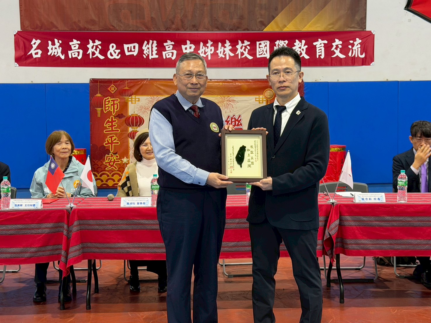 花蓮四維高中校長蔡忠和(左)致贈日本名城高校副校長米原次穂(右)本土玫瑰石匾。
