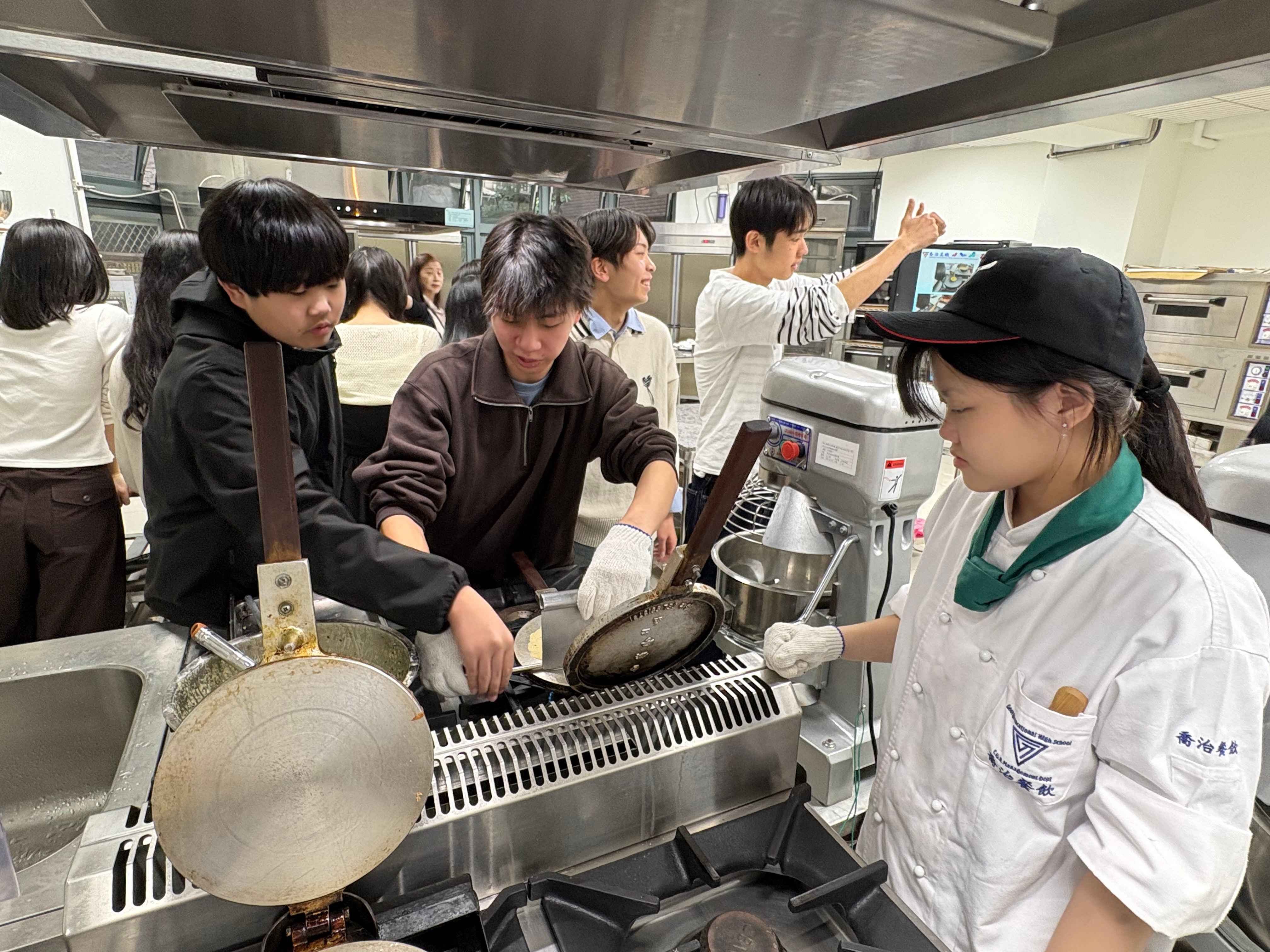 技職體驗活動精彩豐富,觀光事業科打造「喬治航空」機艙點心服務體驗,「Tea or Coffee」親切問候聲此起彼落,空姐空少的專業架式已經有模有樣;時尚造型科推出「頭皮紓壓」體驗,彷彿走進頂級SPA館,伴隨舒緩音樂,先以一滴精油喚醒嗅覺,彷彿置身森林之中;溫柔的雙手搭配按摩梳,沿著頭皮細緻按壓梳理,層層放鬆,讓人直呼好療癒;照顧服務科的「小小照服員」體驗,細心示範如何協助臥床者安全起身並移位至輪椅,每一個步驟都展現專業與溫度;餐飲管理科的「芝麻蛋捲」製作也暗藏學問—從調製麵糊到下糊煎製,看似簡單,其實講究火候與時間掌握,才能做出色香味俱全、捲度一致的完美蛋捲。