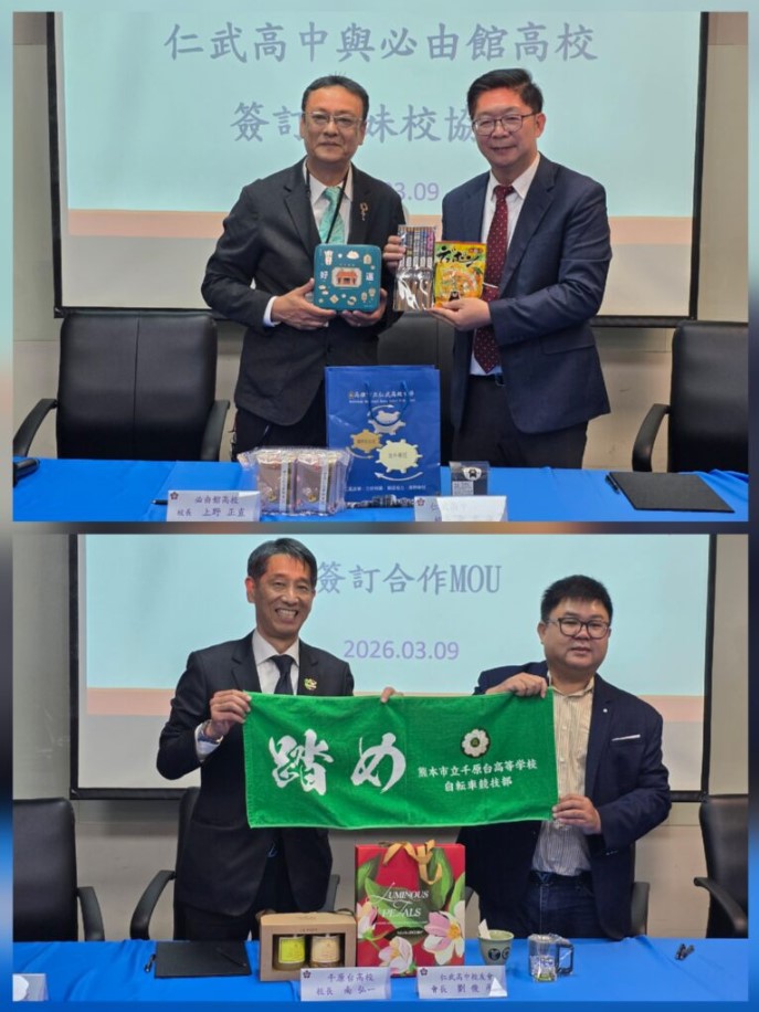 (蕃新聞/王苡蘋報導) 高雄市立仁武高中積極拓展國際教育版圖,今(9)日完成三項重要跨國合作備忘錄(MOU),包括與日本熊本市立必由館高校締結姊妹校、與日本熊本市立千原台高校校友會簽署交流合作備忘錄,以及與熊本學園建立升學聯盟,為學生開拓日本升學新管道,也為台日教育合作寫下新頁。