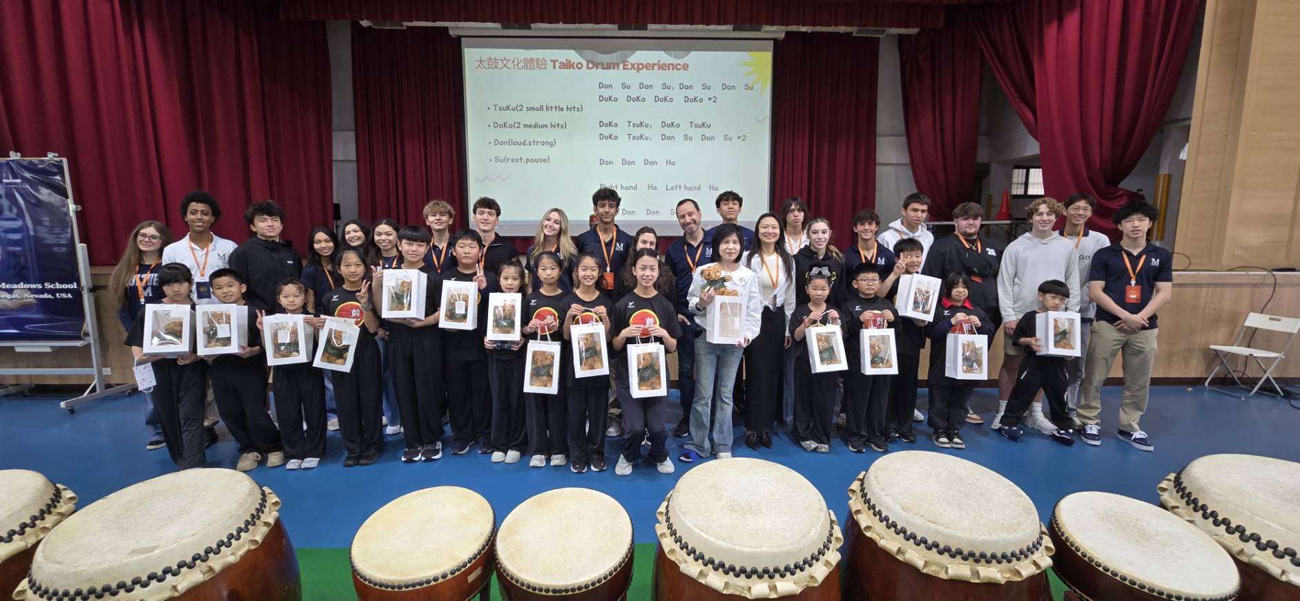 活動在師生及家長的熱烈歡迎與校際紀念品交換儀式中拉開序幕 。首個亮點是由大園國小太鼓隊帶來的精彩表演。太鼓是大園國小的特色藝文項目,學生們精湛的鼓技與整齊劃一的動作,震撼了在場的每一位貴賓。隨後,更安排了互動環節,邀請20位美國高中生上台,在教練和大園學生的指導下親自體驗擊鼓節奏。透過鼓聲的共鳴,跨越了語言的隔閡,開啟了兩校師生的心靈交流。