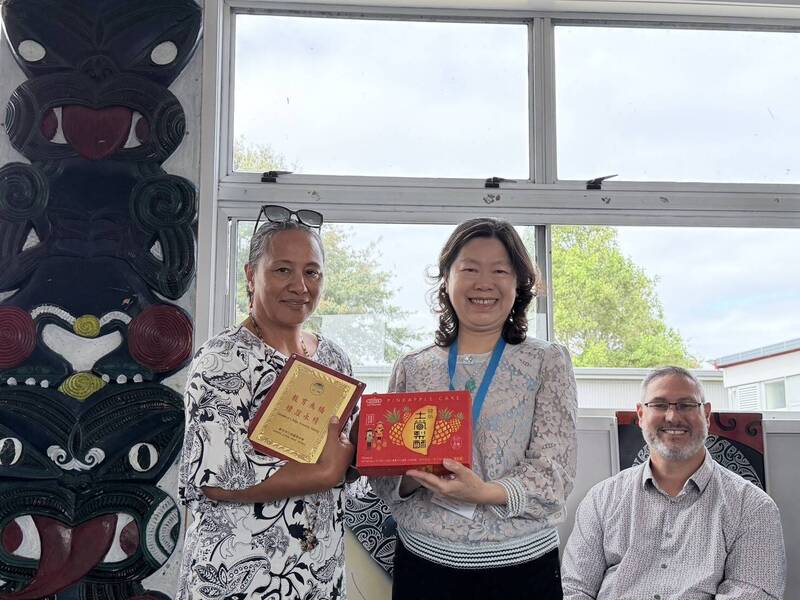走出台灣看見世界!新竹市三民國中今年首發國際教育前進紐西蘭,29名學生體驗毛利文化,校長丁淑觀還送給對方台灣的美食特產鳳梨酥。(圖由學校提供)
