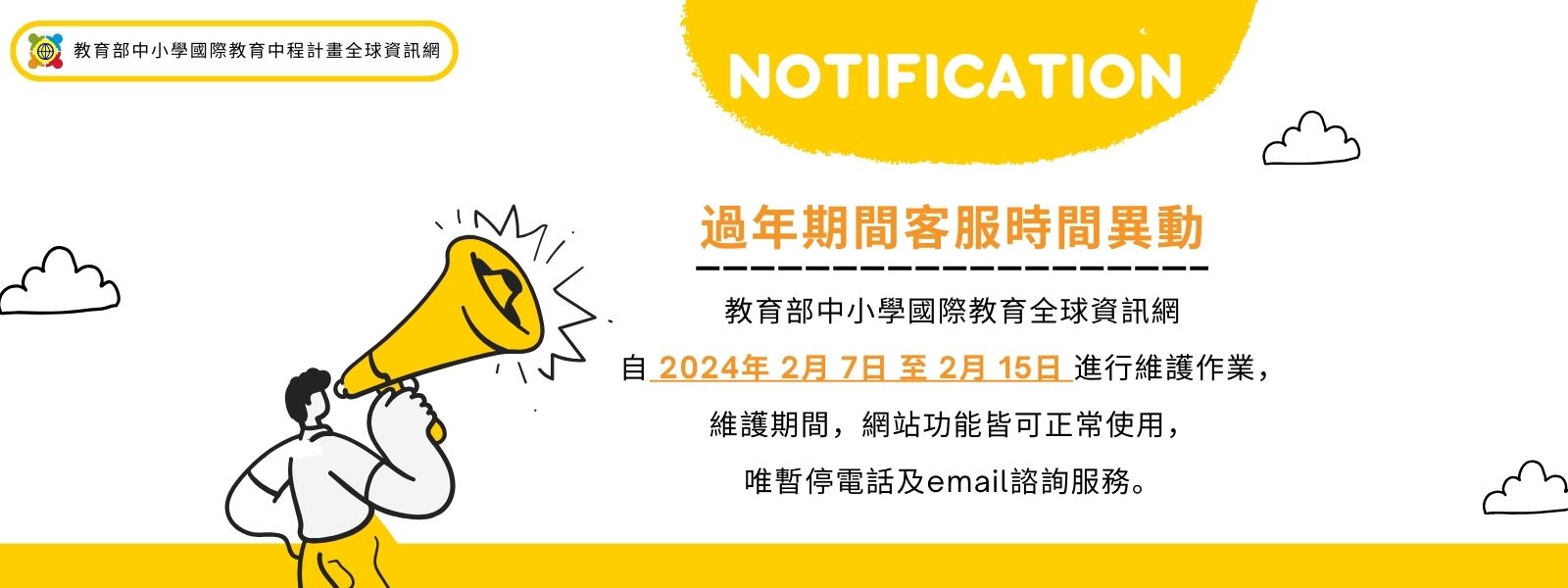 【網站公告】教育部中小學國際教育全球資訊網「過年期間客服時間異動」 2024-02-02 00:00:00 教育部中小學國際教育全球資訊網將自 2024年 2月 7日 至 2月 15日 進行維護作業,維護期間,網站功能皆可正常使用,唯暫停電話及email諮詢服務。 回上一頁