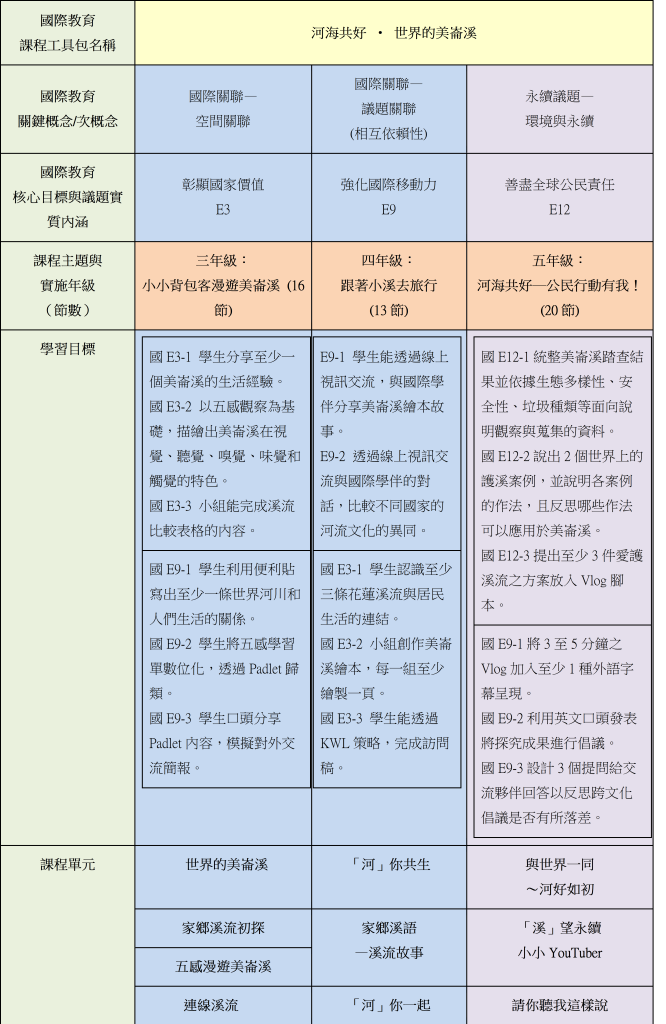 「河海共好‧世界的美崙溪」為本次課程工具包釋例的課程,如圖二所示。本校110-113年度國際教育課程以責任消費為主軸,從探討海廢問題而引發學生探索家鄉溪流的興趣,因此乃設定以「家鄉溪流--美崙溪」為課程主軸,藉由中高年段學生的實地踏查、五感體驗、河域生活故事採集,及延伸的創作,與日本姊妹校進行家鄉主題的線上交流;高年級學生則進一步融入對環境議題的關心,探討世界各國河川復育的案例,並將關懷在地溪流的行動拍成影片,做為與日本姊妹校進行實體交流的素材。