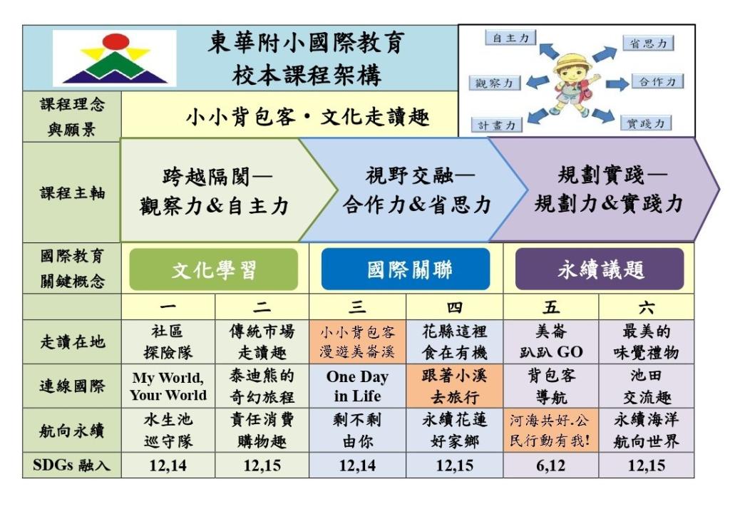 校本國際教育--小小背包客文化走讀,培養學生跨越隔閡、視野交融與規劃實踐的能力,結合在地探索、國際交流與永續議題,於校訂文化走讀課程及國際教育融入領域中實施。國際教育校本課程架構如圖一所示。