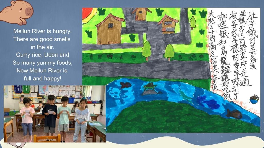 繪本能完整呈現美崙溪居民生活故事,敘事清楚有條理,能清楚感受到家鄉特色。 | 繪本能呈現美崙溪部分生活故事,內容結構清楚,但細節或創意不足。 | 繪本呈現部份資訊,家鄉特色表現不明顯,故事結構較鬆散。 | 繪本內容需由教師引導,故事結構鬆散,內容待充實。 |