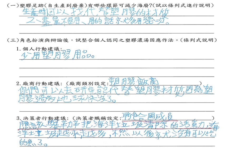 成果分析:學生能分析塑膠足跡,分析其歷程中可能的塑膠垃圾減量之道,並能對塑膠進行SWOT分析,並從不同的角色定位構思減緩塑膠汙染的永續行動。 |