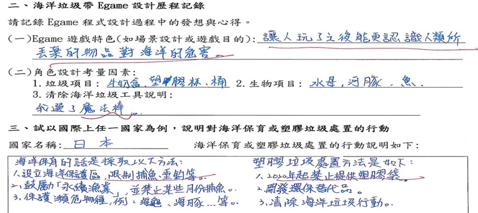 成果分析:學生能蒐集與說明國外塑膠廢棄物處置行動策略,並以遊戲程式呈現海洋塑膠垃圾汙染狀況,並以程式設計呈現其因應行動。 |
