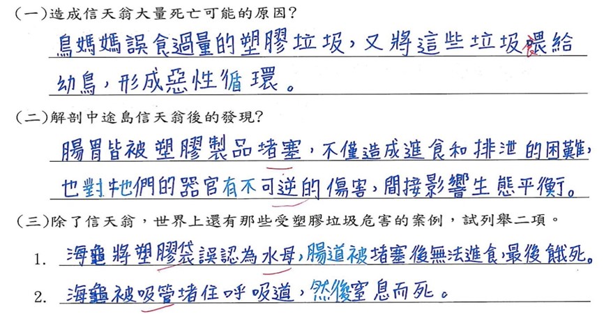 成果分析:學生能描述中途島信天翁死亡的主要原因,說明塑膠垃圾造成哪些生態的危害,描述全球塑膠垃圾污染的事實。 |